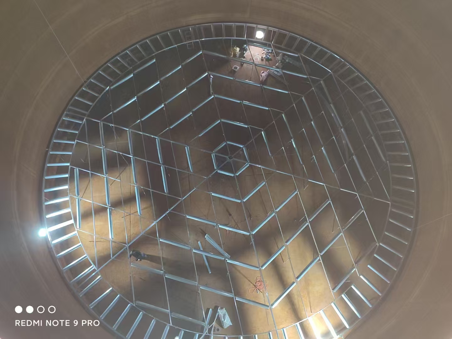 按照材質的不同,組裝式儲罐內浮頂可分為鋁制內浮頂及鋼制內浮頂。鋁制內浮頂采用仿生蛛網型結構,主要用于儲存輕質油,例如汽油、航空煤油等;鋼制內浮頂材質選用304或316L不銹鋼,用于腐蝕性強的液體化學品的儲罐,多采用井字形結構,使用壽命比鋁制內浮頂更長,結構強度更大。